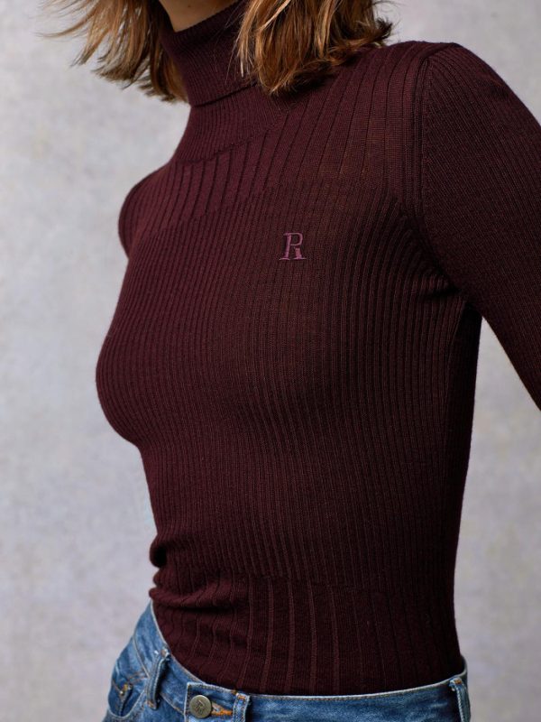 Ribbed knit turtleneck with long sleeves.