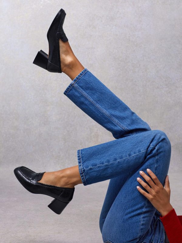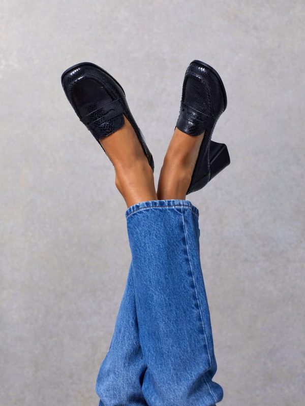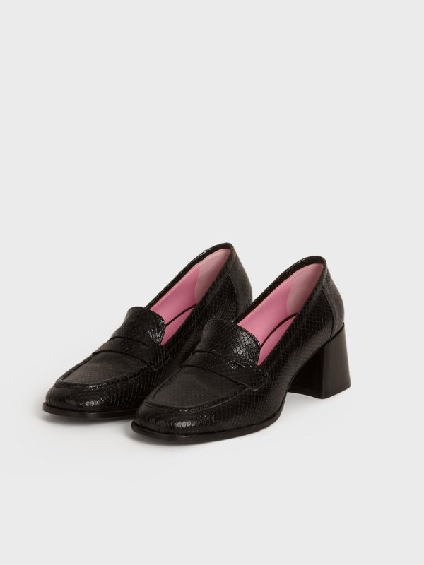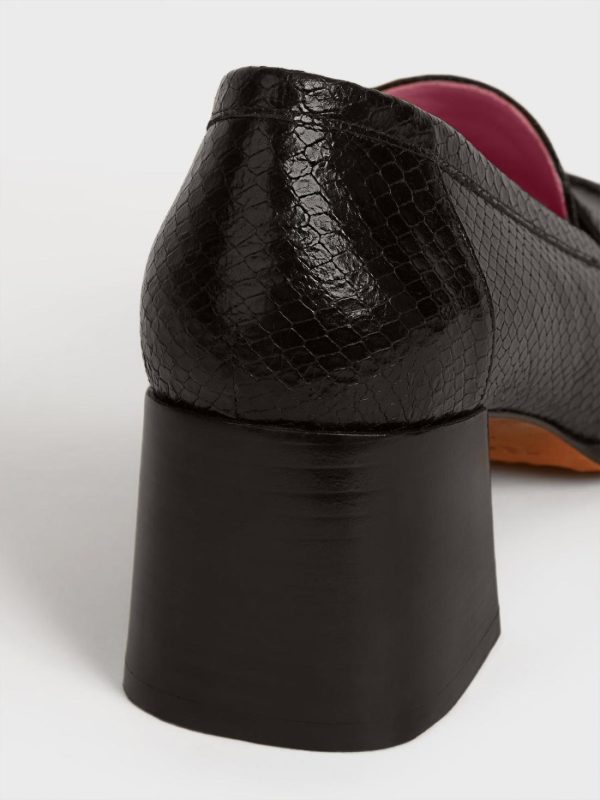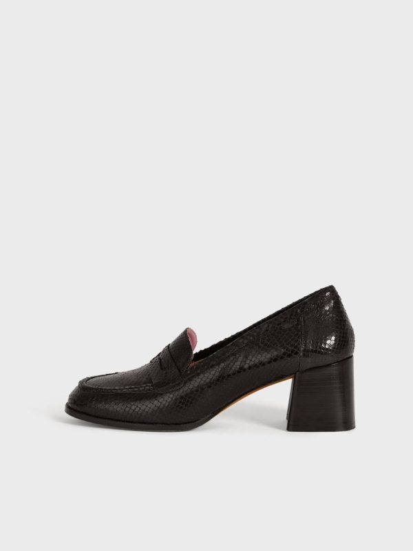 Heeled moccasins in python-effect leather.