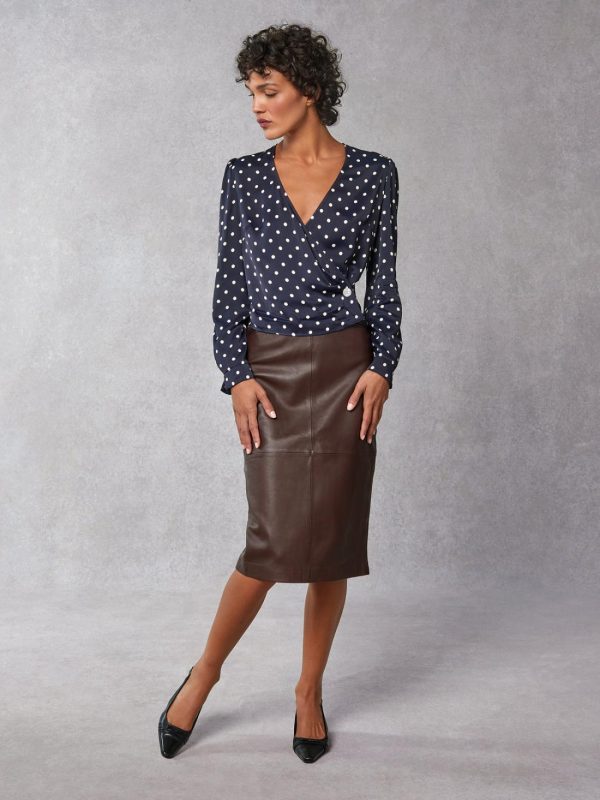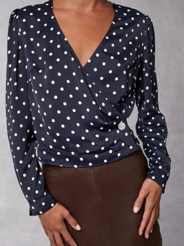 Long-sleeved wrap-around blouse.